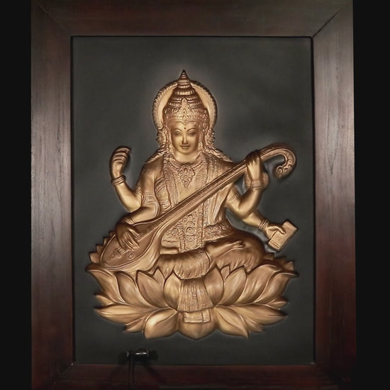 This stunning 3D wall frame captures the divine and benevolent form of Goddess Saraswathi, the consort of Brahma and the embodiment of wisdom, fine arts, and eloquence. Rendered in a brilliant gold finish, this piece is ideal for students, artists, musicians, writers, and anyone seeking intellectual and creative inspiration.