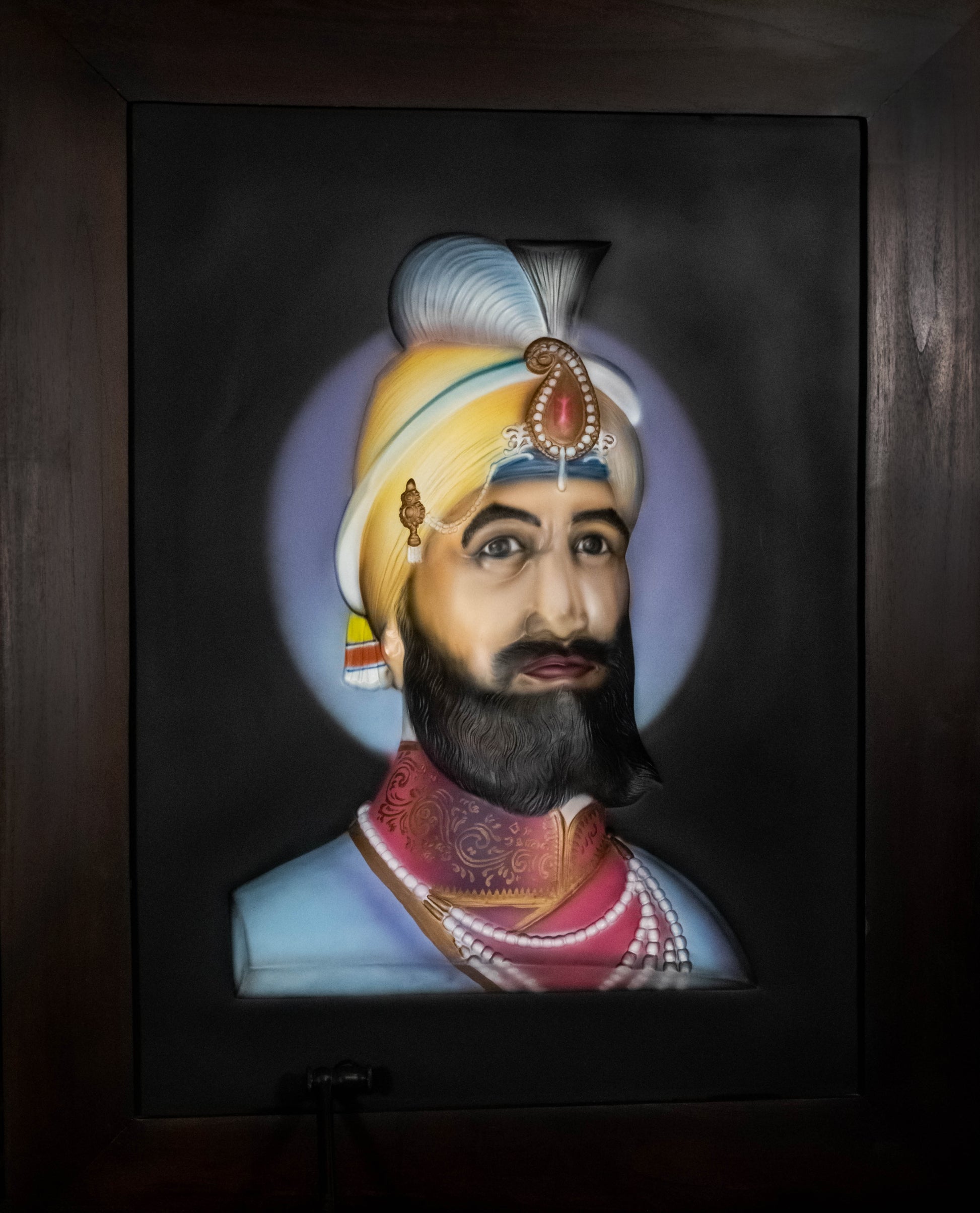 - Elegant Shadow Box Frame: The detailed 3D sculpture is set within a deep, sturdy frame with a rich, dark wood finish. The shadow box construction creates a dramatic contrast, emphasizing the luminosity of the Guru's portrait.